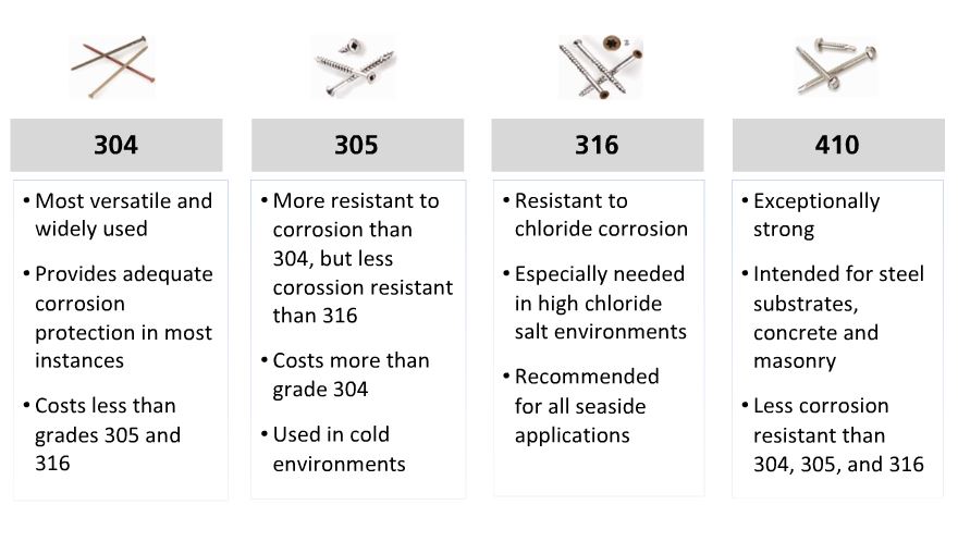Some stainless steel fasteners are treated to a passivation process. The can involve putting fasteners through an acid bath that removes iron from the nail's surface, followed by an oxidizer to force conversion of chromium into an oxide form. This is done to mimic the nature self-passivation process in order to immediately enhance the corrosion resistance of the fastener.